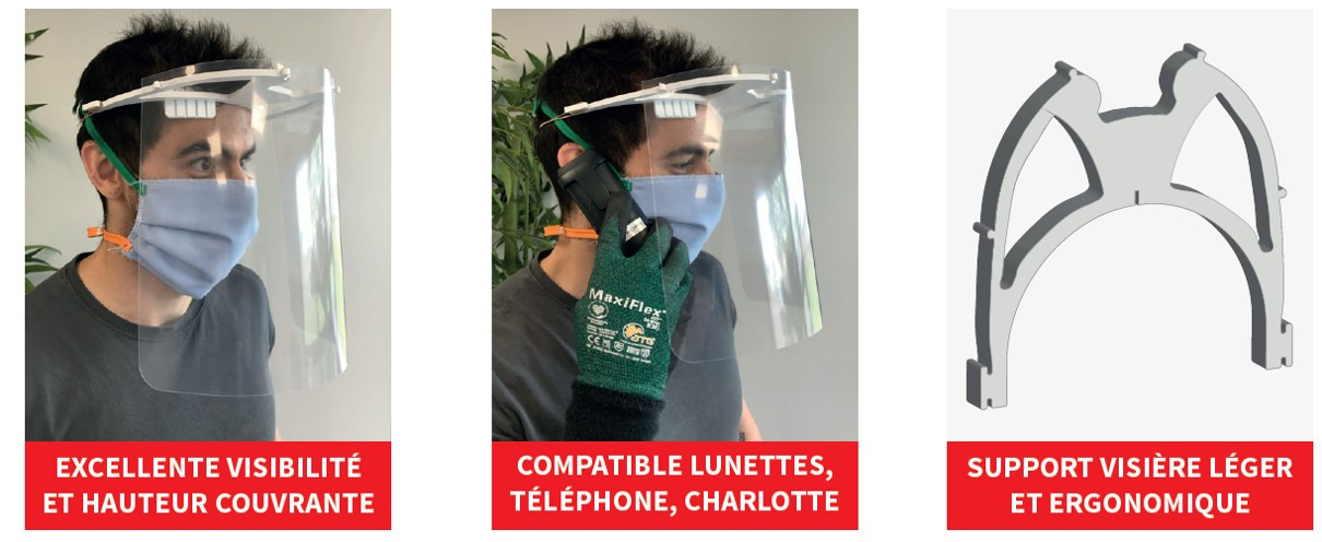 Visière légère et ergonomique de 60g. 2 modules de confort, pour un maintien agréable. Étudiés pour être compatible avec - lunettes - téléphone - charlotte - tous type de masque